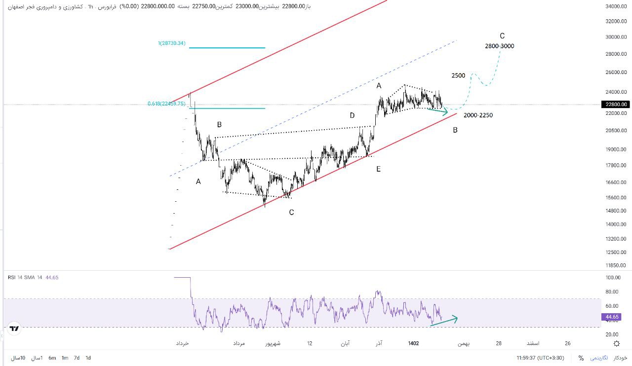 ولی در تایم ساعتی پس از یک رشد خوب و رسیدن به محدوده ۲۴۰۰ تومان در اواخر خردادماه شاهد ریزش سهم و شکل گیری الگوی مثلث هستیم . سپس الگوی صعودی شروع شده و A تا حوالی سقف خرداد پیش رفته و حال در حرکات ساید و فشرده سهم هستیم که B را میسازد . زمان صرف میکند و دیامتریک شکل گرفته. انتظار داریم سهم یا کسب انرژی و واگرایی مثبت سهم از محدوده ۲۰۰۰_۲۲۵۰ یکی دو هفته آتی حرکت موج صعودی C را آغاز نماید.